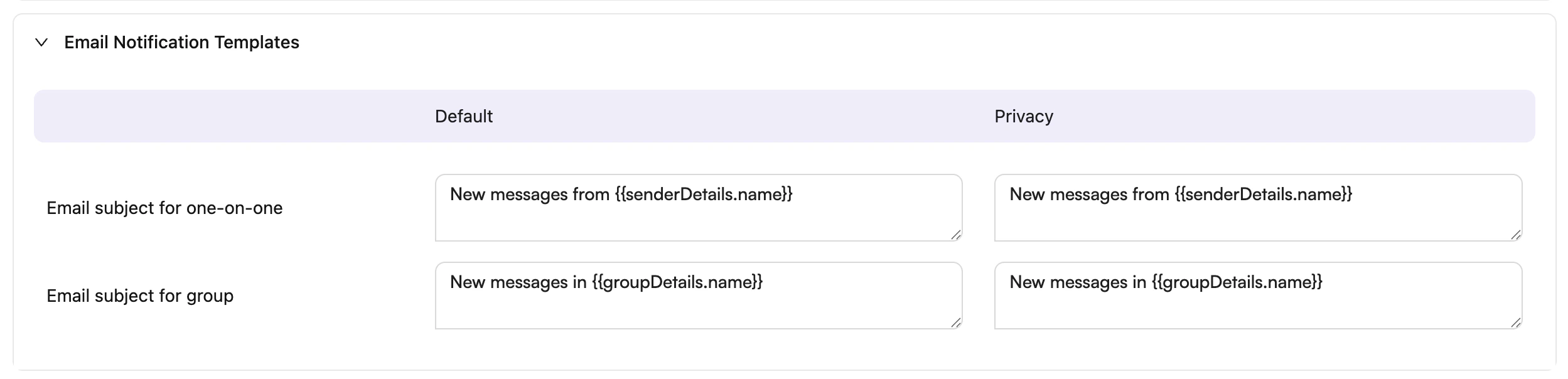 You can use the provided subject field or build your own using senderDetails.name and groupDetails.name. Here are default and privacy-focused subject templates: