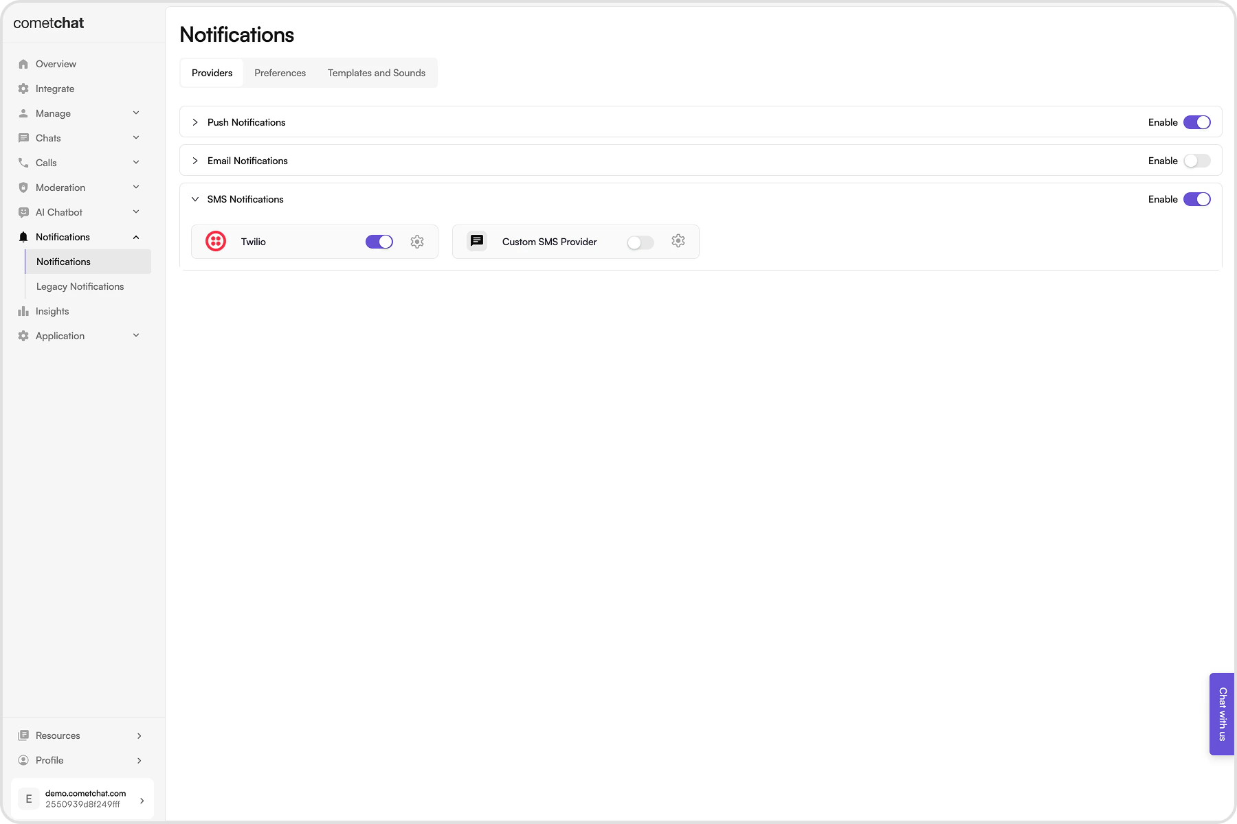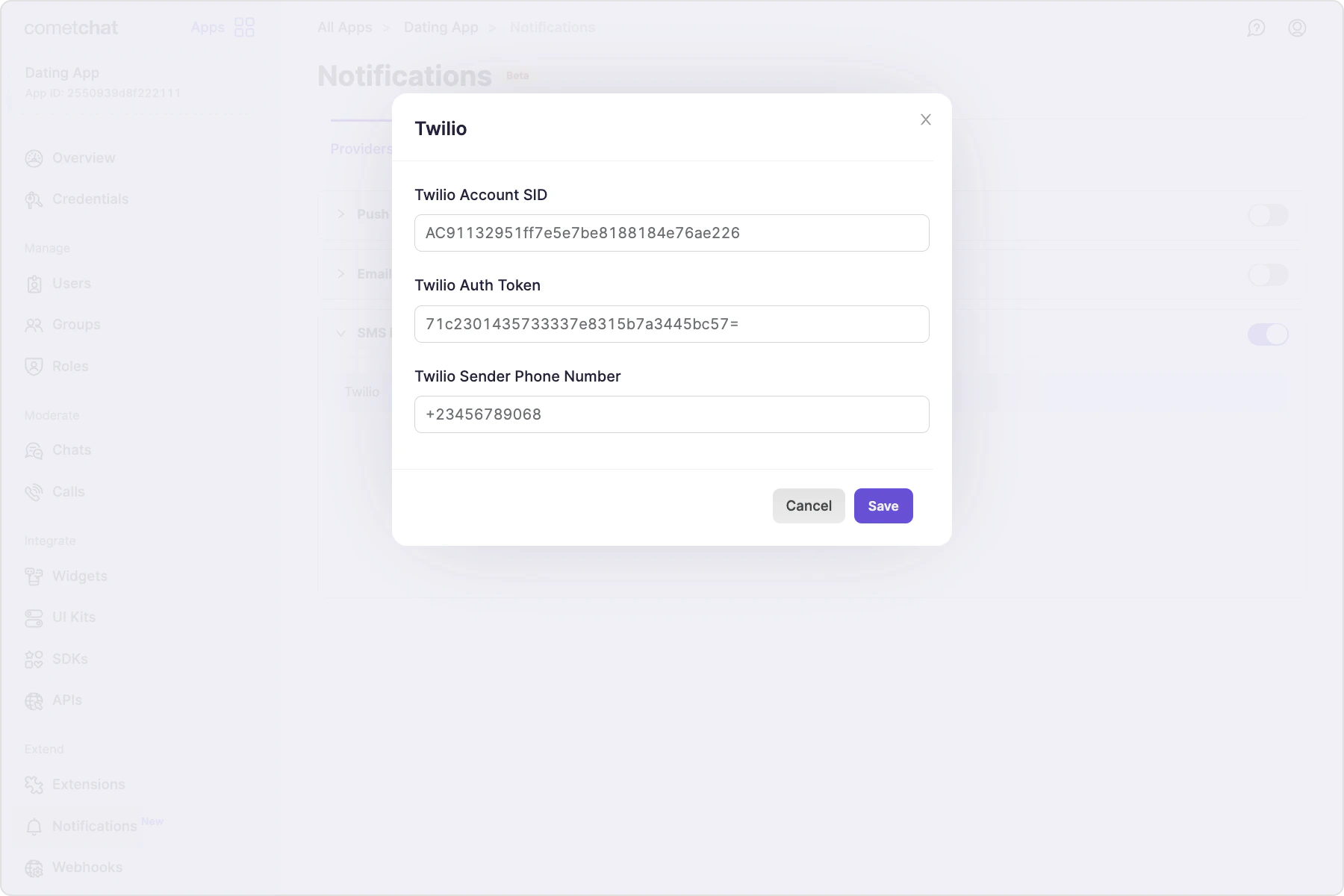 Connect CometChat SMS notifications to Twilio or your own provider. Twilio is built-in; use a custom provider if you prefer another SMS gateway.