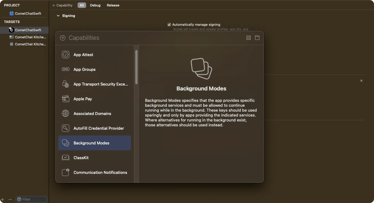 Click on Targets -> Project -> [+ Capability] -> Add ‘Background Modes’ section.