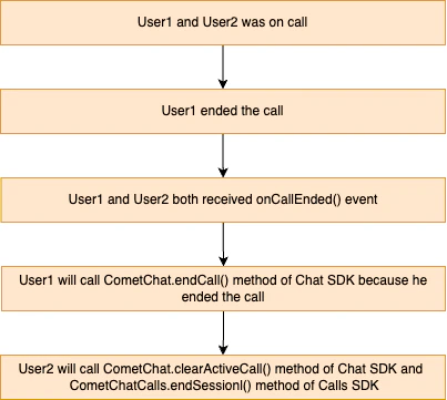 When using the Ringing flow, you must coordinate between the CometChat Chat SDK and the Calls SDK to properly terminate the call and notify all participants.The Ringing flow requires calling methods from both the Chat SDK (
