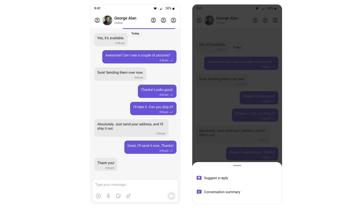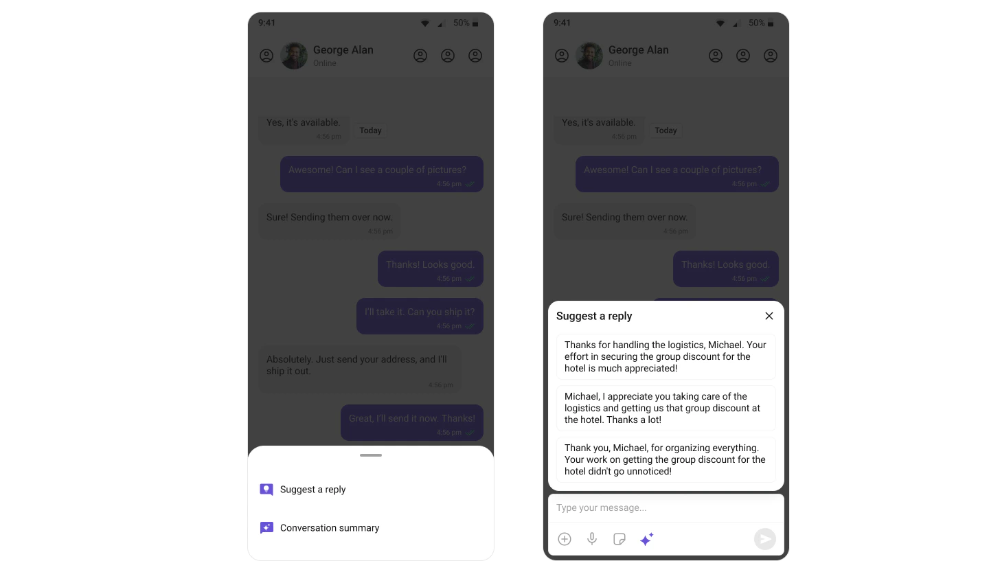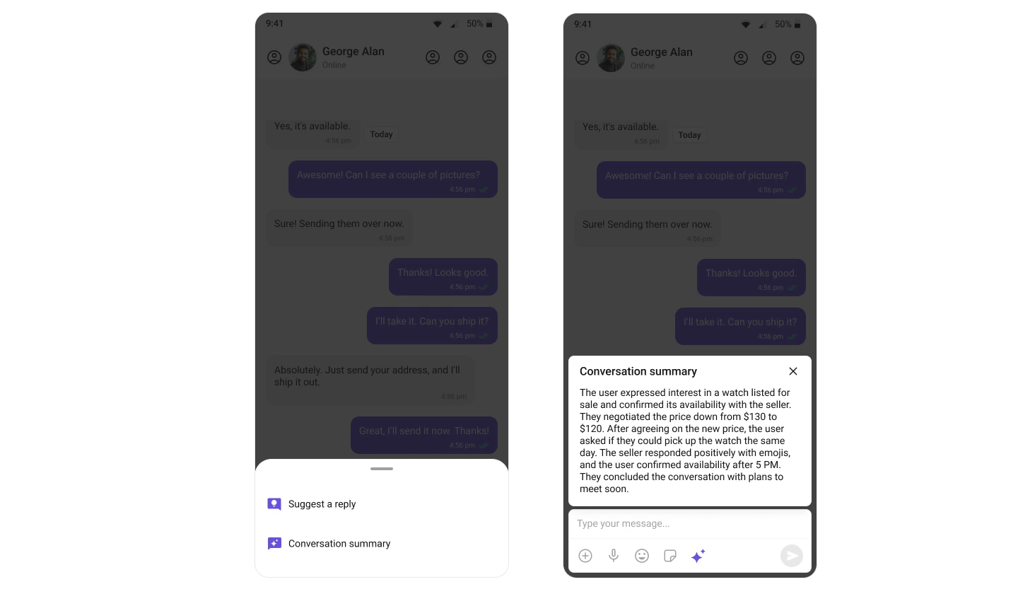 | AI features | Conversation Starter, Smart Replies, Conversation Summary |