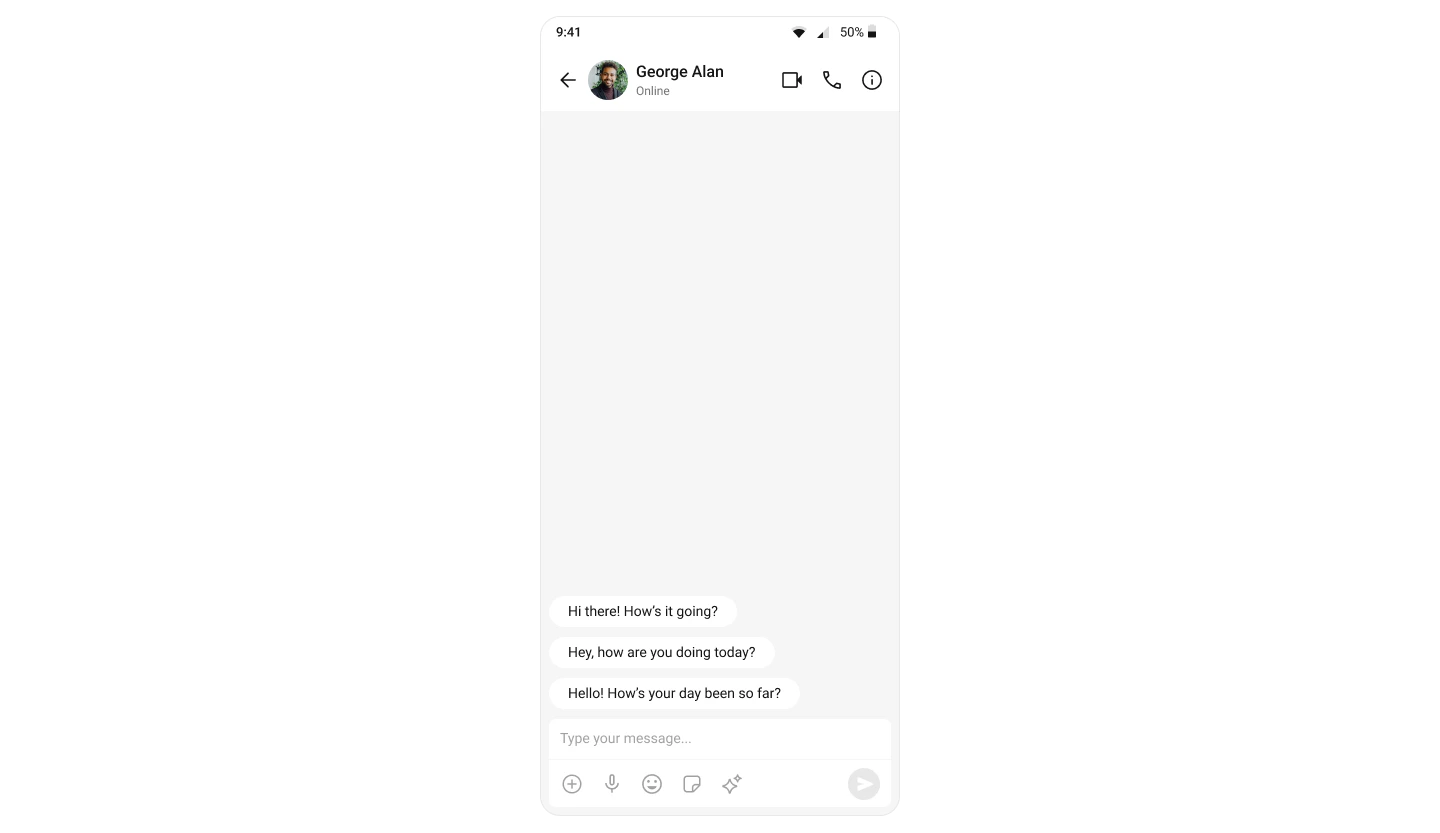 When a user initiates a new chat, the UI kit displays a list of suggested opening lines that users can select, making it easier for them to start a conversation. These suggestions are powered by CometChat’s AI, which predicts contextually relevant conversation starter options. For a comprehensive understanding and guide on implementing and using the Conversation Starter, refer to our specific guide on the Conversation Starter. Once you have successfully activated the Conversation Starter from your CometChat Dashboard, the feature will automatically be incorporated into the MessageList Component of UI Kits.