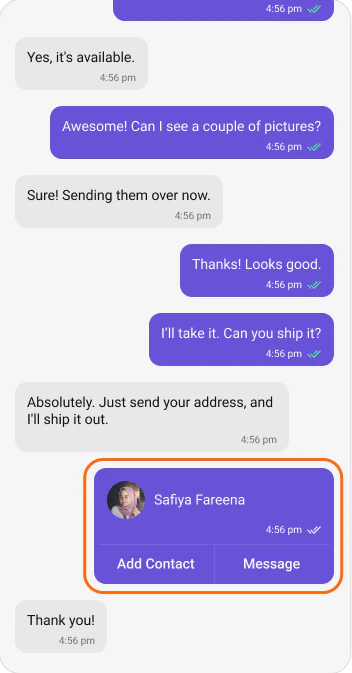 "card"appear in theMessageListas a purple contact card showing the contact’s avatar, name, timestamp, delivery receipt (for sent messages), and two action buttons (“Add Contact” and “Message”).