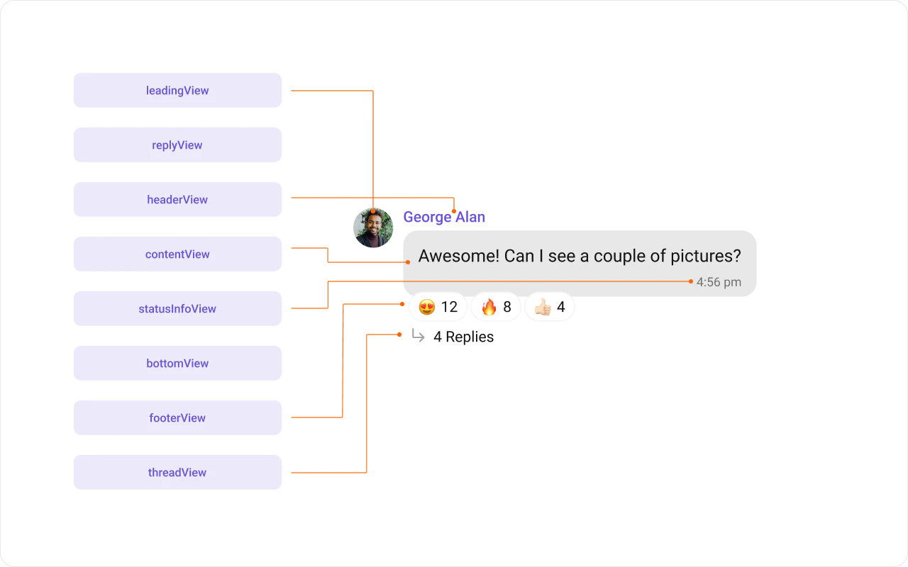 MessageBubblefor messages from others and on the right for messages from the current user. - Header view: Displays the sender’s name. This is useful in group chats where multiple users are sending messages.