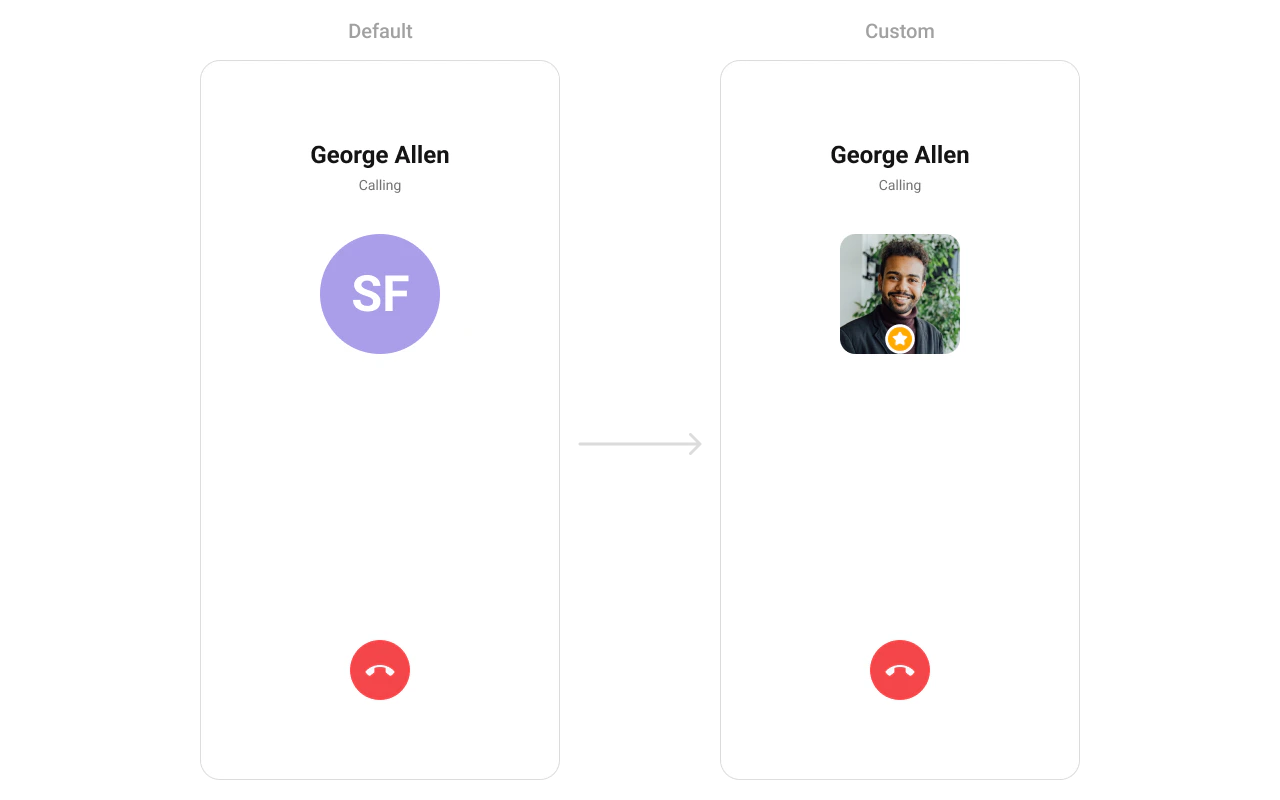 What this does: Registers a callback that receives theExample with admin badge:ContextandCallobject and returns a customViewto replace the default avatar area on the outgoing call screen.