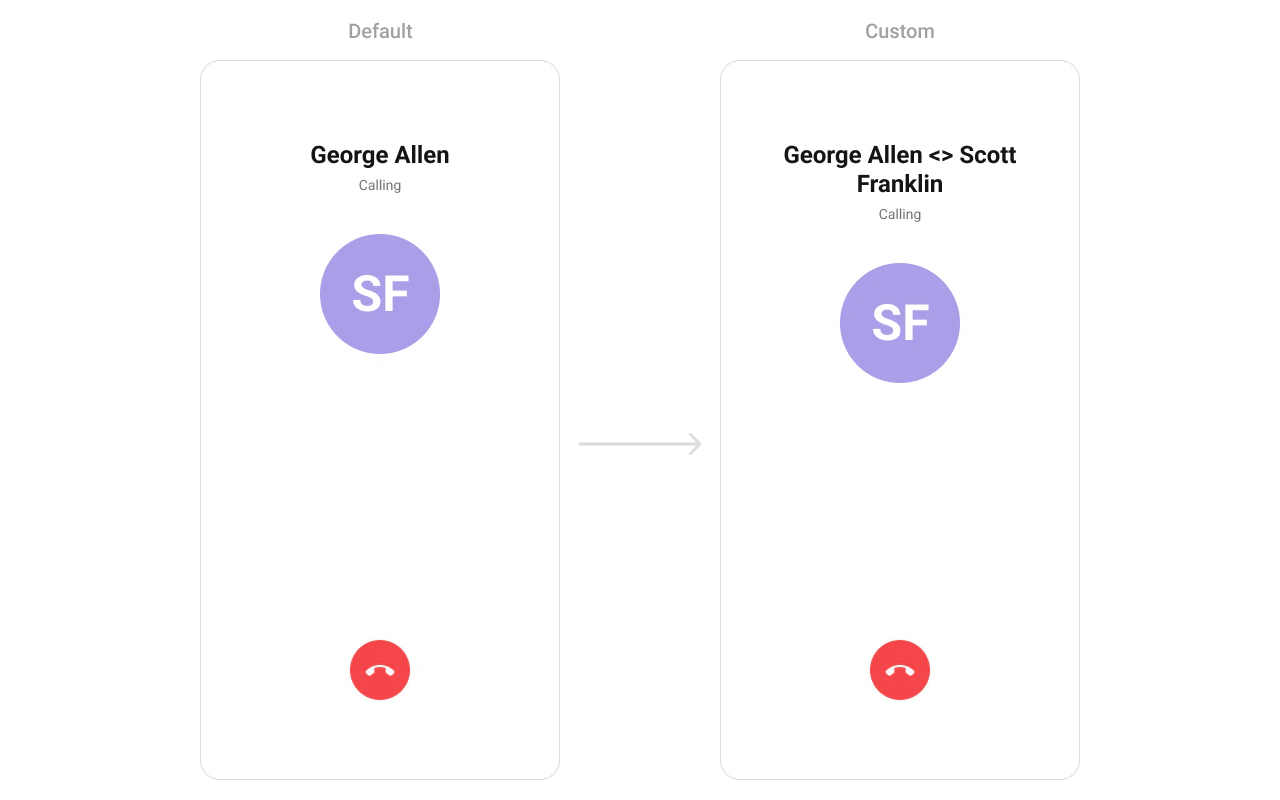 What this does: Registers a callback that receives theExample with sender and receiver names:ContextandCallobject and returns a customViewto replace the default title area on the outgoing call screen.