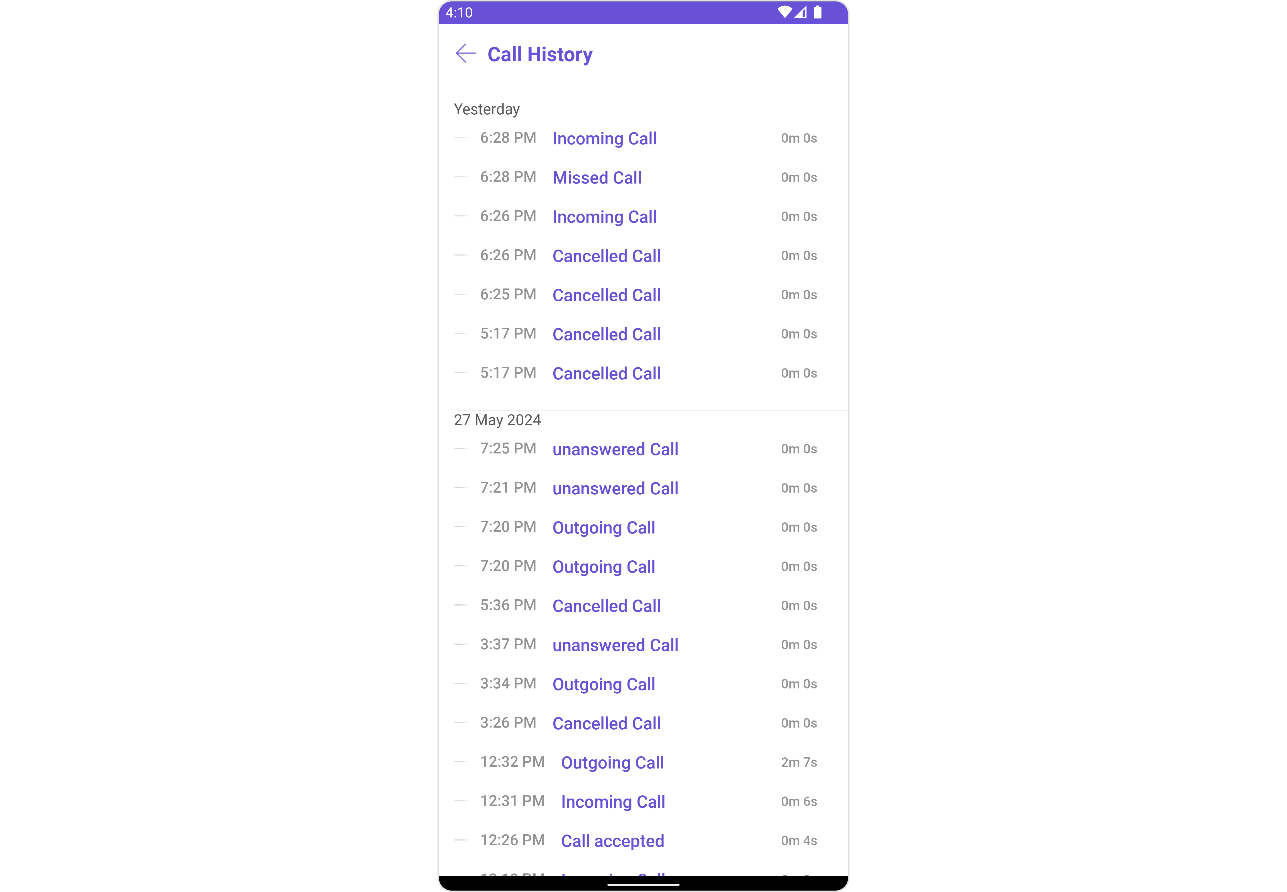 The CallLogRequestBuilder enables you to filter and customize the call list based on available parameters in CallLogRequestBuilder. This feature allows you to create more specific and targeted queries during the call. The following are the parameters available in CallLogRequestBuilder- Java