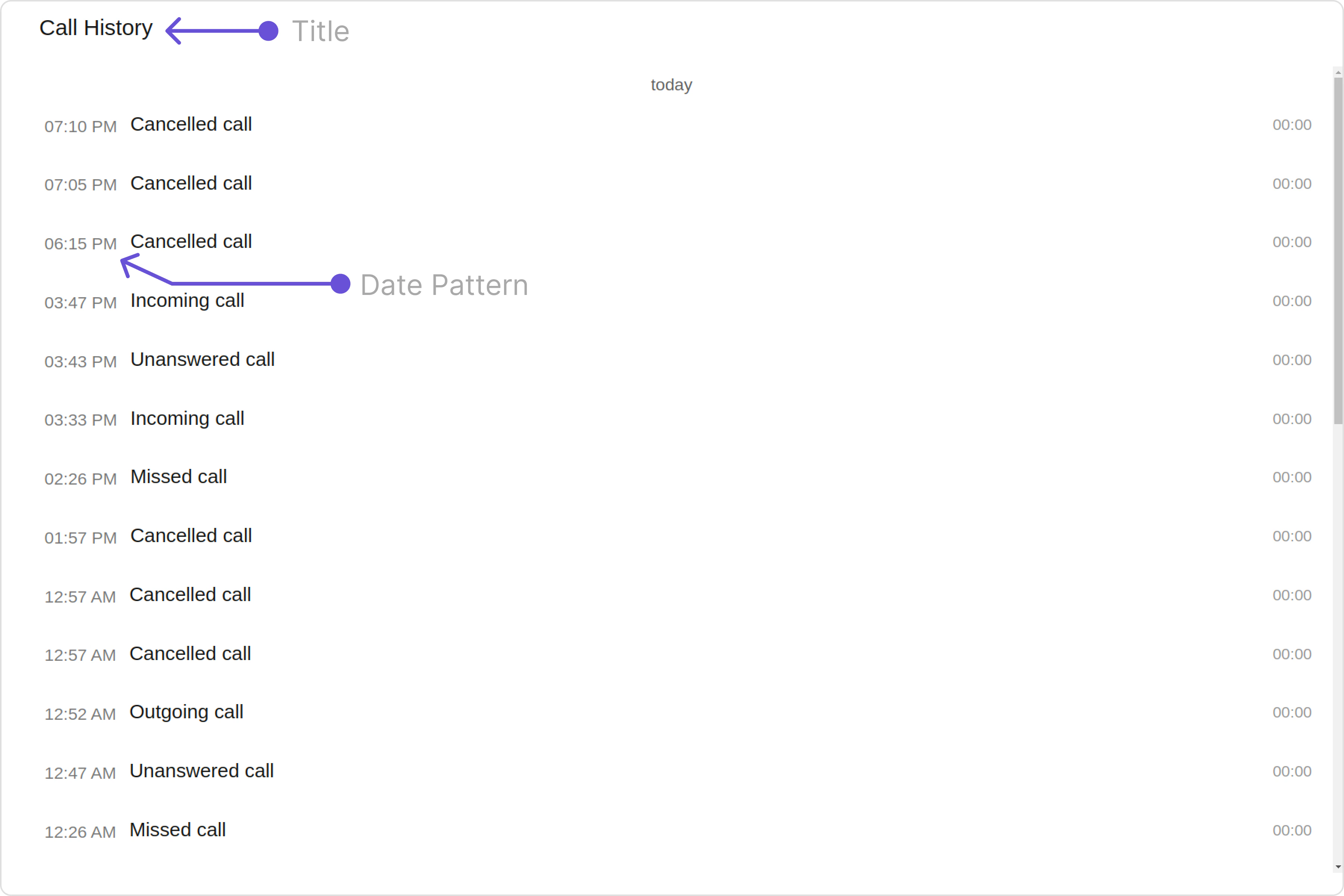 To customize the appearance, you can assign a CallLogHistoryStyle object to the Call Log History component. Example In this example, we are employing the callLogHistoryStyle.