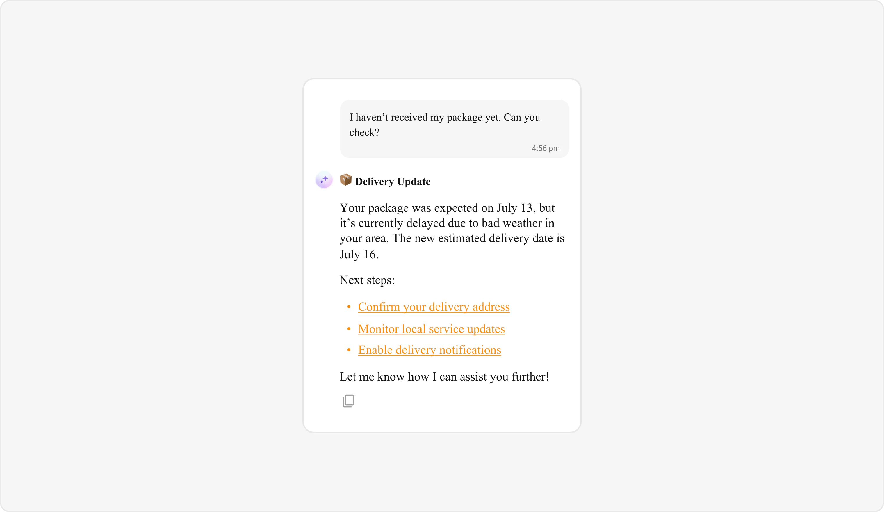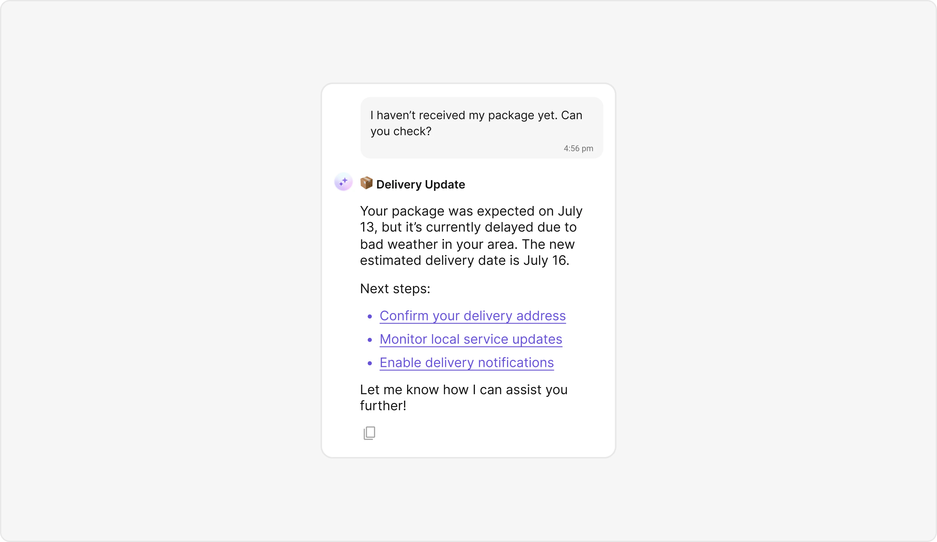 AI Assistant bubbles display messages and interactions from an AI assistant within the chat interface. Default