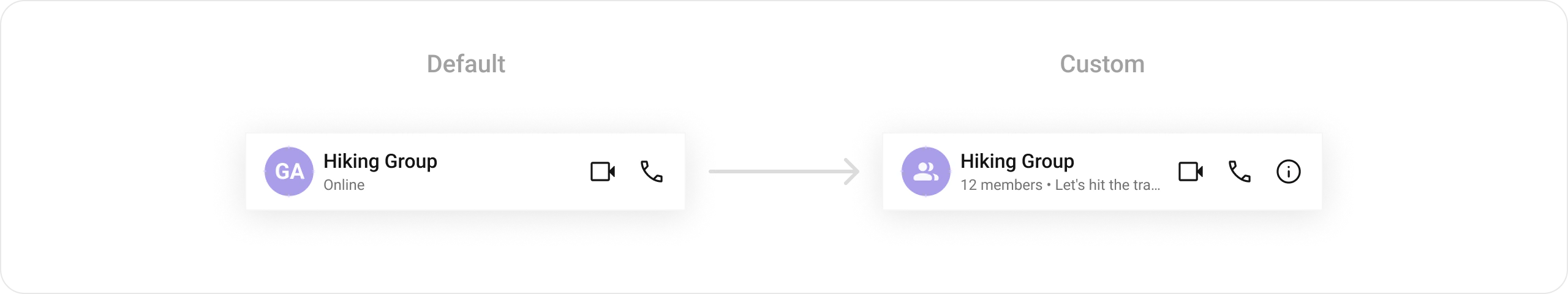 trailingViewList<Widget>? Function(User? user, Group? group, BuildContext context)?Set appbar options for the trailing view.