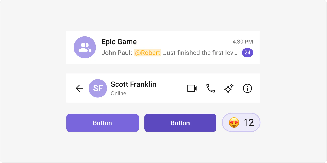 --cometchat-primary-colorBrand accent, outgoing bubble bg, active states, links, buttons#6852D6Outgoing bubbles, send button, active tabs, links