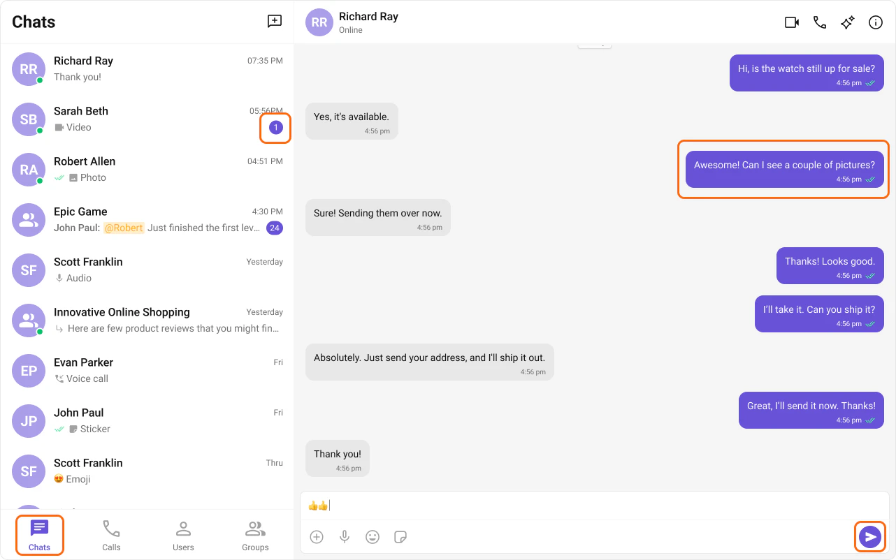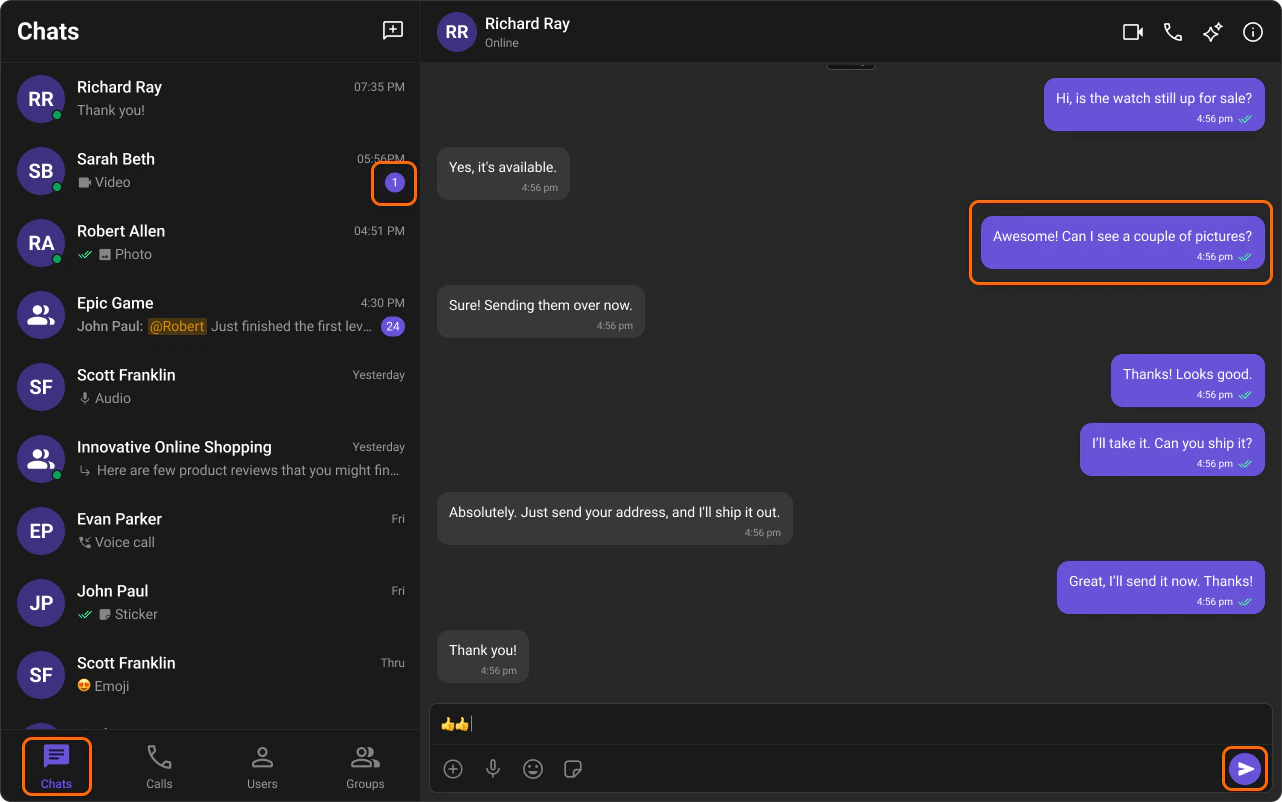 Expected result: All primary-colored elements (outgoing bubbles, buttons, active states, links) change from purple (#6852D6) to orange (#f76808) in both light and dark modes.