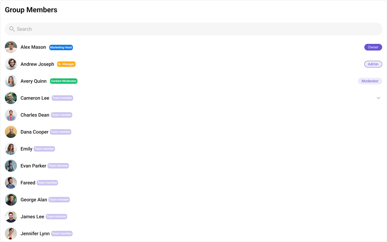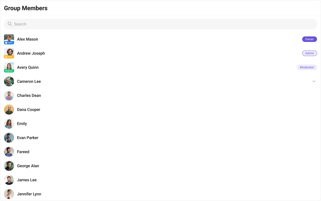 CometChatGroupMembers is a Component that displays all users added or invited to a group, granting them access to group discussions, shared content, and collaborative features. Group members can communicate in real-time via messaging, voice and video calls, and other activities. They can interact, share files, and join calls based on group permissions set by the administrator or owner.