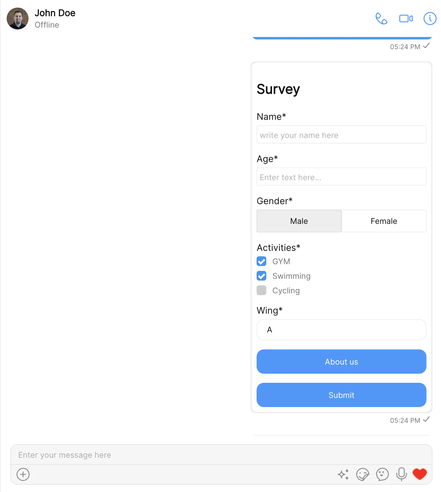 messageFormMessageAn instance of the FormMessage class which holds information about the form fields. The form inputs are dynamically built based on the form fields’ information in the message.